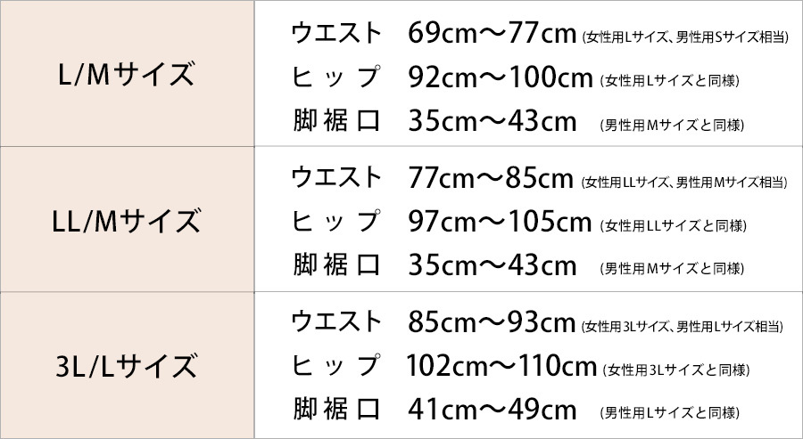 ✔️【L/Mサイズ】の場合、お腹回りとお尻は女性Lサイズ、脚裾口は男性Mサイズ相当です。